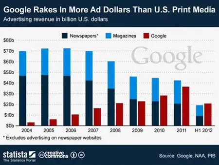 Just saw a news blurb from Statista, that illustrates the meteoric rise of online advertising. In the first 6 months of this year Google generated over 20 billion (that's billion with a "b") dollars in advertising revenue. Compare that to just under 20 billion for the entire U.S. print media industry (that's all newspapers and magazines). Some o...